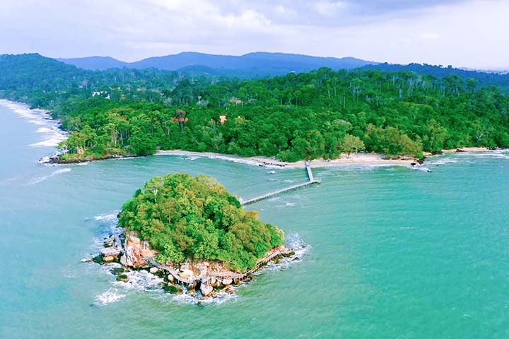 Koh Sampoch is a natural resort located in Smach Deng village, Ream commune, Prey Nob district, Preah Sihanouk province, about 25 km from the Two Lions roundabout and about 7 km from the Sihanoukville International Airport and only 200 meters from the beach. It has a full potential of nature such as the beautiful small islands, white sand beaches, jungle and a wooden bridge about 200 meters long. Once there, tourists can enjoy many activities such as swimming, relaxing on the beautiful beach, enjoying the natural scenery along the wooden bridge, taking photos, looking at the view of the sunset, taking the boat tour, looking at the mangrove forest, taking the island tour and other recreational activities.